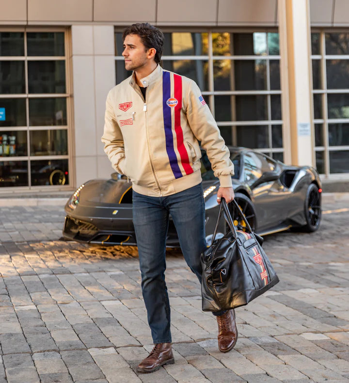 The Bomber version of our best selling Gulf Roadmaster Jacket - with an elastic waistband instead of a straight cut. With it's iconic racing stripes in navy and red, plus a Gulf logo at the chest, it speaks to your unmistakable passion for motorsports. This jacket is hits just above the hip. Our rugged, durable cotton canvas helps beat the chill and adds style to casual comfort. In a classic sand color that goes with everything.