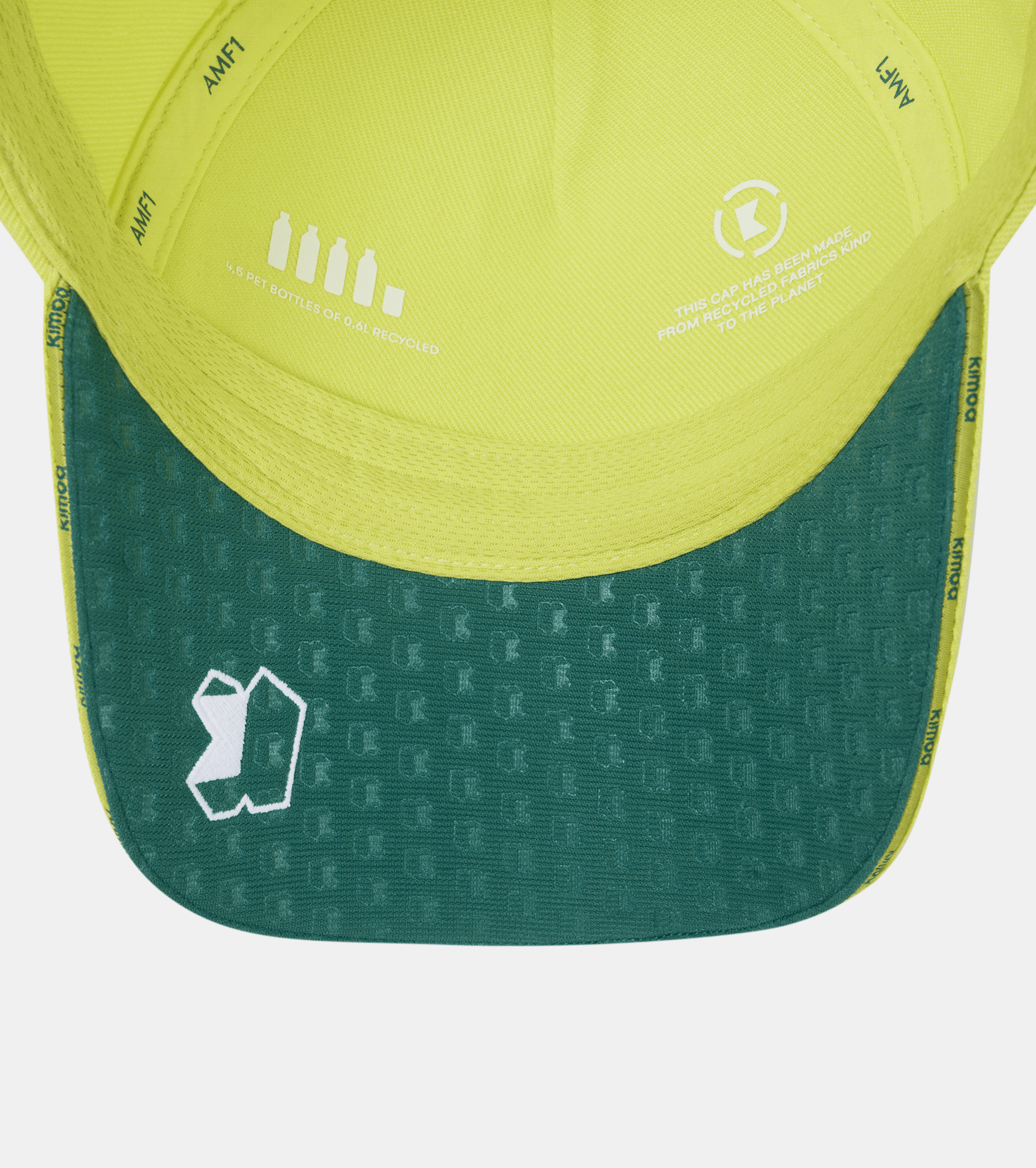 Aston Martin F1 team x Kimoa five panels adjustable curved peak cap in black color twill made with recycled fabrics and contrast lime color details.
